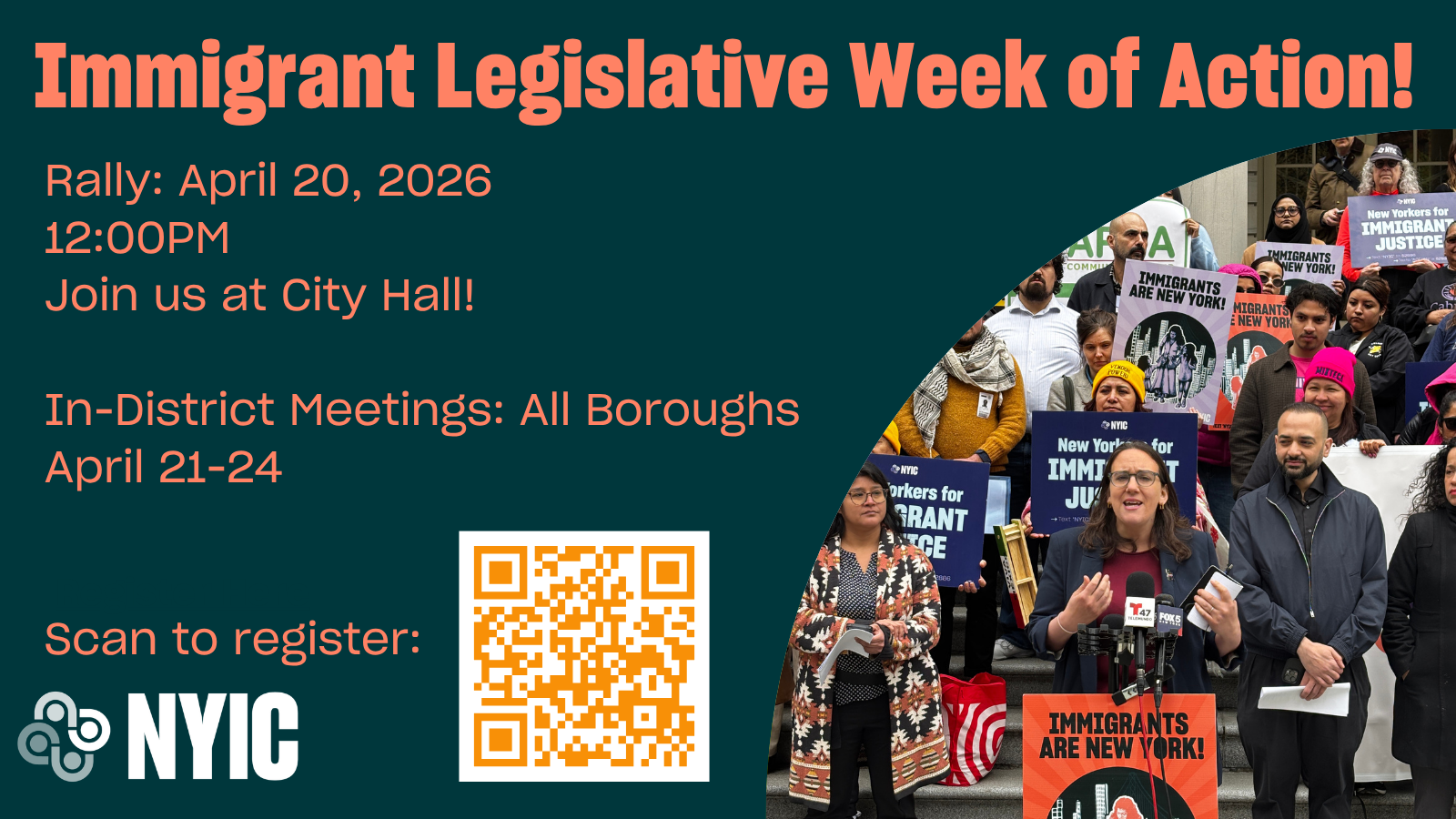 We’re kicking off our Immigrant Week of Action with a rally at the steps of City Hall on April 20 at noon, followed by in-district meetings with elected officials across all five boroughs from April 21–24.