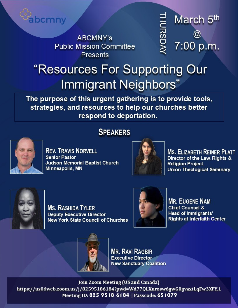In preparation for this online event, we are providing the following: Immigration Statements by ABCUSA, ABCMNY, ABHMS; a PMC Resource Guide; a YouTube recording of our Spring Rally teaching on immigration concerns ABCMNY Spring Rally seminar Know Your Rights presentation here. by New York Immigration Coalition at its website https://www.nyic.org/.