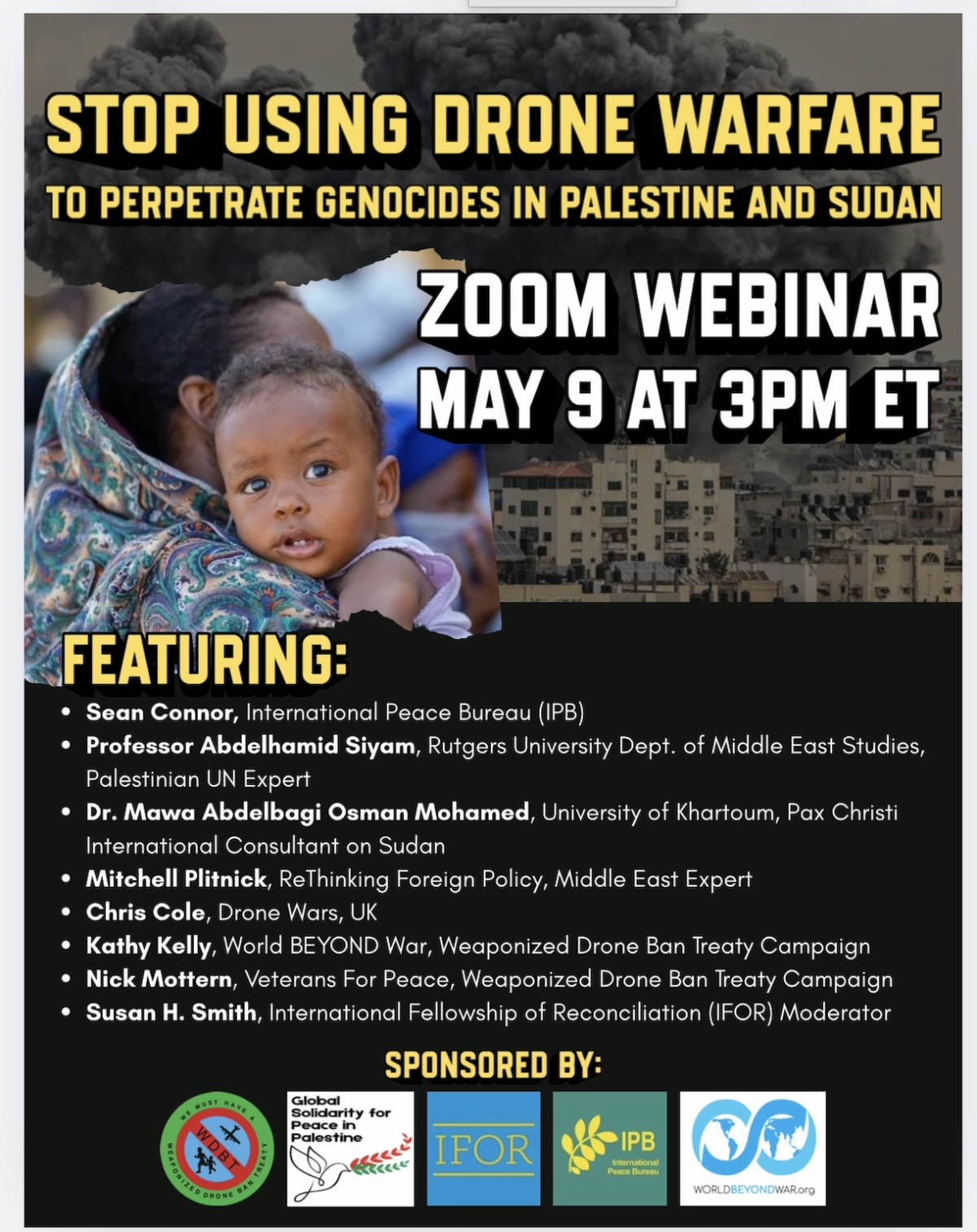 The International Fellowship of Reconciliation (IFOR), as part of the International Peace Bureau-led Global Campaign on Military Spending and annual Global Days of Action on Military Spending (GCOMS/GDAMS) https://ipb.org/events/gdams-2026/ has joined with World BEYOND War, the Weaponized Drone Ban Treaty Campaign, Pax Christi International, and the Global Solidarity for Peace in Palestine network to convene a Zoom webinar on Saturday, May 9th at 3 pm (ET) to discuss weaponized drone warfare against Palestine and Sudan, and the roles of the United States, Israel and the United Arab Emirates, along with their allies and proxies, in perpetrating these mass slaughters.